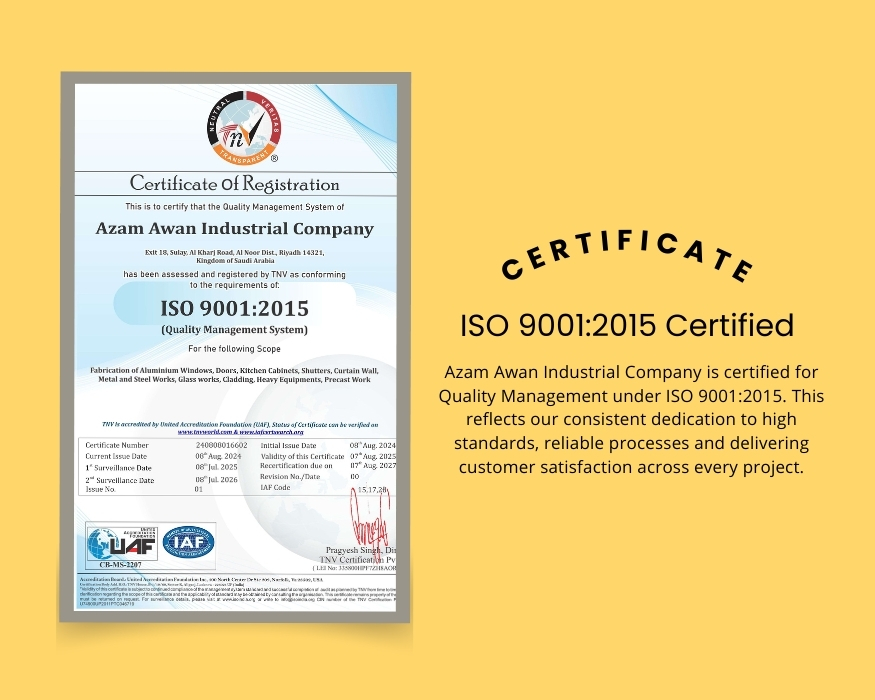 At Azam Awan Company, we deliver expert aluminum, steel, glass and cladding solutions—built strong for the Saudi climate.